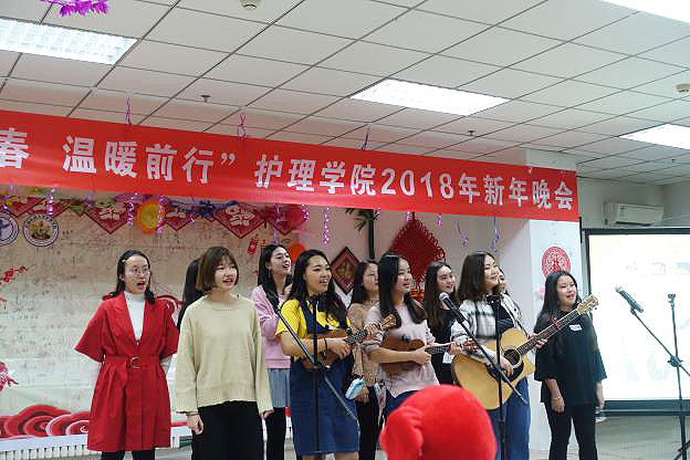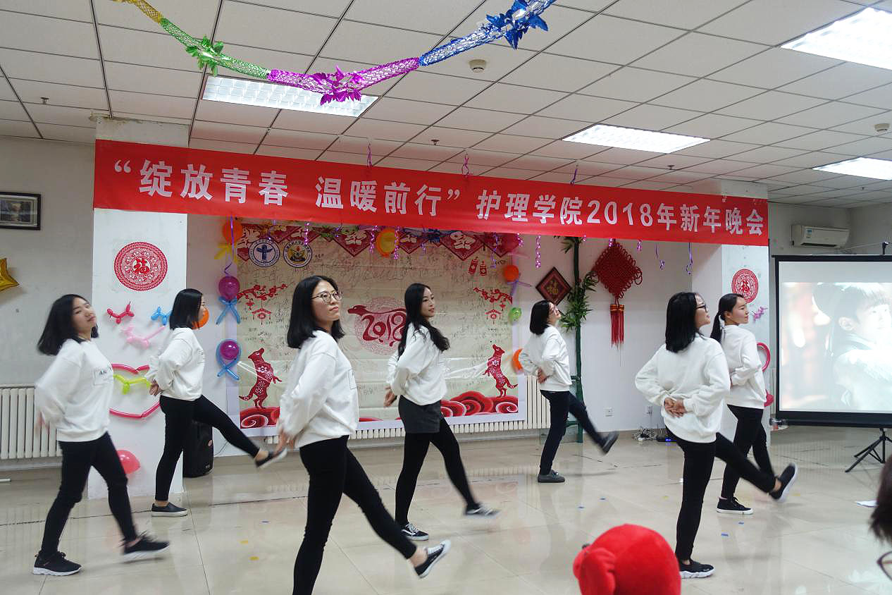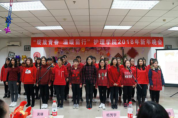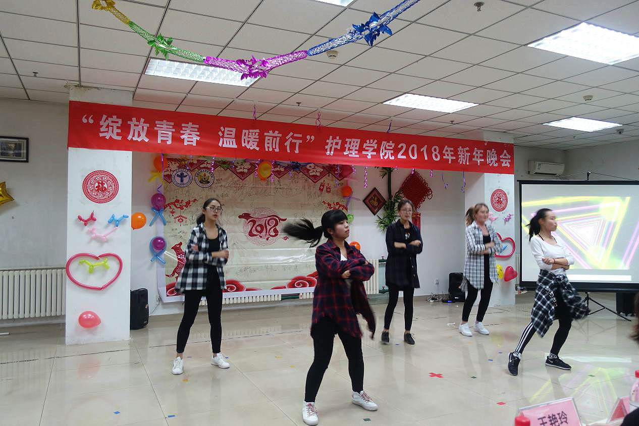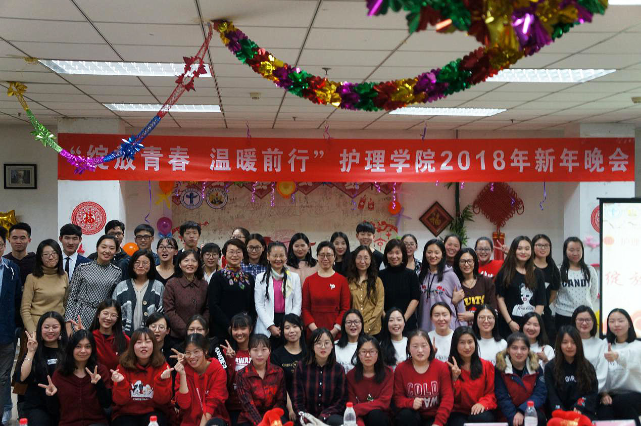 201712月27日晚上六点,九色视频 在博乐楼302活动教室举办了“绽放青春,温暖前行”2018年新年晚会,此次晚会主要由学院学生会文艺部主办,宣传联络部和其他部门协助,九色视频 院长吴瑛老师、学院党总支书记魏京云老师、学院副院长杨芳宇老师和王艳玲老师,学院党总支副书记金玲玲老师以及其他学院老师们也出席了本次晚会。15级、16级、17级护理本科班以及17级研究生班的学生们在新年晚会上的表现更是大放异彩。节目形式多种多样,效果令人赞不绝口。