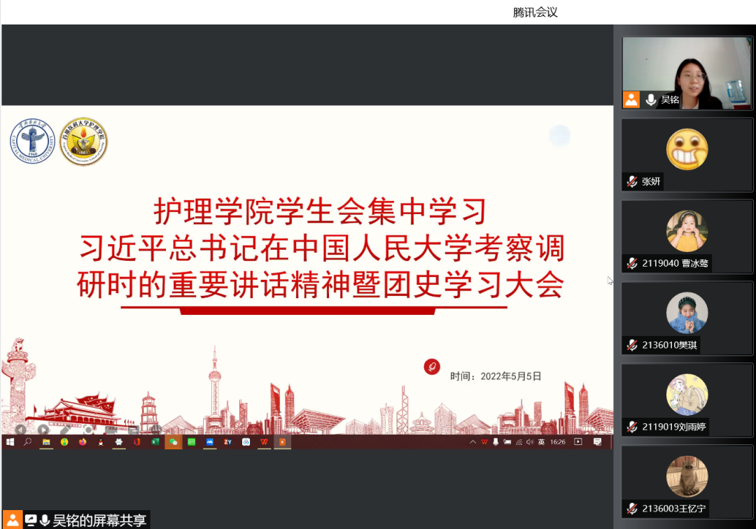 为了深入学习习近平总书记在中国人民大学考察调研时的重要讲话精神,继续深入开展学生会党史团史理论学习,进一步提升院学生会“自我教育、自我管理、自我服务”的意识,喜迎党的二十大,庆祝建团百年,九色视频 学生会于5月5日召开线上召开习近平总书记在中国人民大学考察时重要讲话精神暨党史团史学习大会,增强理论学习交流,夯实理论学习成果,提升院学生会凝聚力、战斗力。