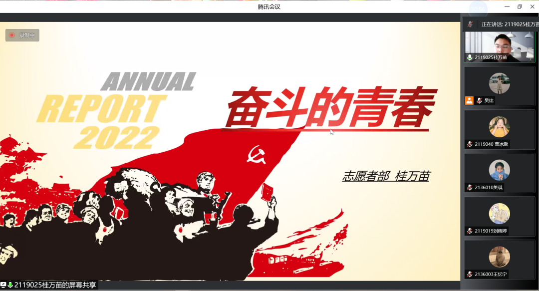 生活部王忆宁同学梳理了共产党、共青团的发展脉络史,同时着重表达了此次党史团史学习的收获和感悟。“我们青年要振奋起来,行动起来,笃行不怠,以青春之我、奋斗之我,担时代之责,做新征程的奋进者、开拓者、奉献者。”